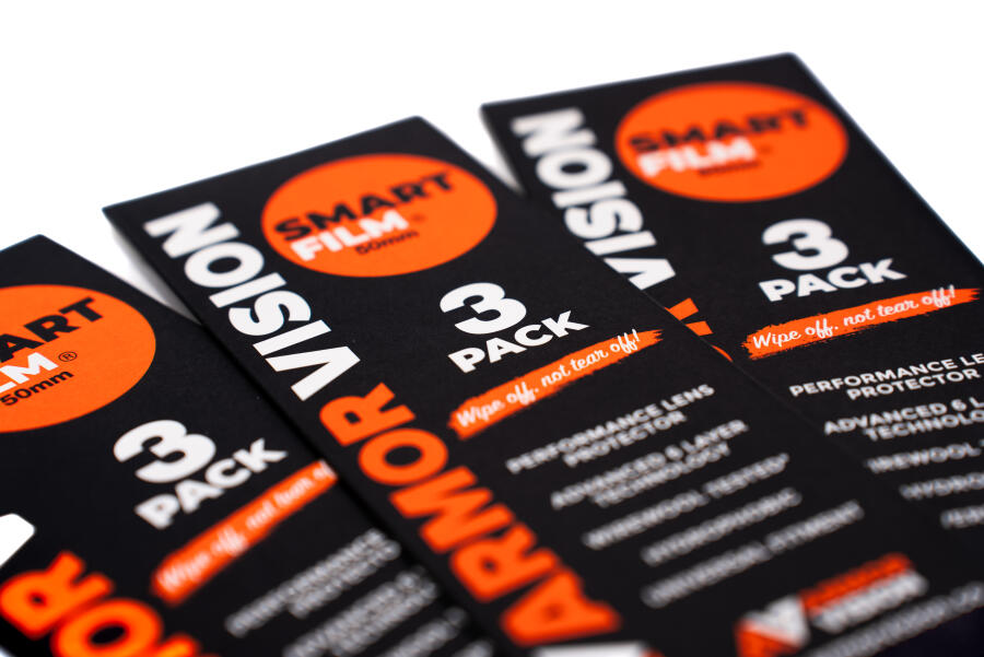 PACK OF 3 SmartFilm™ Lens – Using the same HISC technology as our Impact lenses, we have created a universally fitting clear lens protective strip which will allow you to wipe away water, mud and grit to no end without scratching your lens. No more running out of tear offs, no more messed up roll off systems. As used by many top racers. Available in 36mm and 50mm widths to fit youth and adult goggles. In pursuance of and subject to the provision of Registered Designs Act 1949, the design of which a representation of specimen is attached, has been registered as of the date of registration shown above in the name of company(a) in association with ArmorVision. SmartFilm™ | Patent Pending in the UK and United States of America.